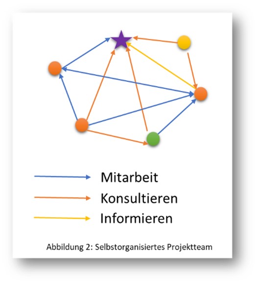 In diesem Bild bedeuten blaue Pfeile Unterstützung und Mitarbeit. Orange Pfeile bedeuten Konsultation. Entscheidung werden strukturiert nach Konsultation getroffen. Es wird sichergestellt, dass Experten eingebunden werden und Erfahrene: