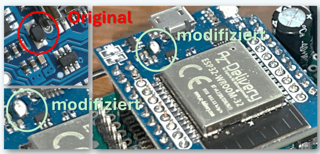 Für meine Schaltung habe ich mich daher entschieden, diese Schutzdiode zu entfernen, d.h. durch eine Lötbrücke zu ersetzen (modifiziert). Dadurch liegt die volle 5V-Spannung direkt am ESP32 an, was die Boot-Stabilität sicherstellt. Beachtet, dass durch diesen Eingriff der Verpolungsschutz über diesen Pin entfällt. Wenn ihr diese Modifikation ebenfalls vornehmt, stellt sicher, dass ihr die Polung eurer 5V-Versorgung immer korrekt anschließt, wie gezeigt. Ganz wichtig: Ihr dürft den ESP auch in keinem Fall gleichzeitig über den VCC-Pin mit Spannung versorgen UND an den PC anschließen (z.B. um die Software zu aktualisieren). Das Vorgehen dafür beschreibe ich später noch detailliert. Hier findest du ein Video, wie du die Schutzdiode entfernst bzw. überbrückst.