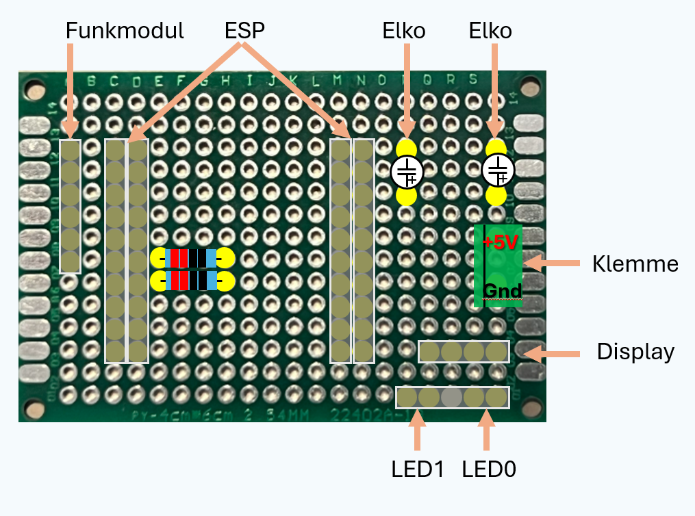 Lötet dies bitte exakt wie hier gezeigt ein, indem ihr einfach die Löcher abzählt. Danach werden die beiden Widerstände und die Elkos aufgelötet (Polarität beachten). Schließlich löten wir die 2 polige Anschlussklemme (aus dem Platinenset) ein.