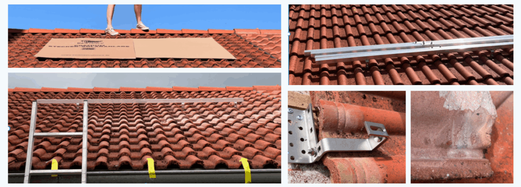 - Montage: Damit geht’s aufs Dach. Die Halterungen werden ausgerichtet und danach befestigt. Falls eine Querverlattung vorhanden ist, achten wir darauf, dass die Schrauben im dicken Dachbalken enden (diese sind erst mal nicht sichtbar). An der Dachpfanne über dem Halter muss der Aufliegenoppen entfernt werden (Flex, Meisel), um Platz für die Halterungen zu schaffen.