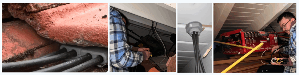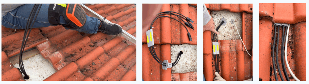 - Kabelmanagement: Ich verwende 3D-gedruckte Kabeldurchführungen, um die Kabel vor scharfen Kanten der Dachziegel zu schützen, und sie zu sortieren. Auf unserem Dach gab es auf den Dachbalken eine Querverlattung, daher habe ich mir zur Durchführung nach innen eine zusammensteckbare Kabeldurchführung gedruckt.