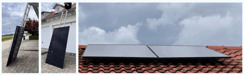 - Anheben der Module aufs Dach: Die Module werden mit einer Leiter und einer dicken Holzlatte, die oberhalb der Dachrinne aufliegt, nach oben befördert. Eine Person schiebt das Modul von unten hoch, während eine andere Person auf dem Dach es empfängt und platziert.