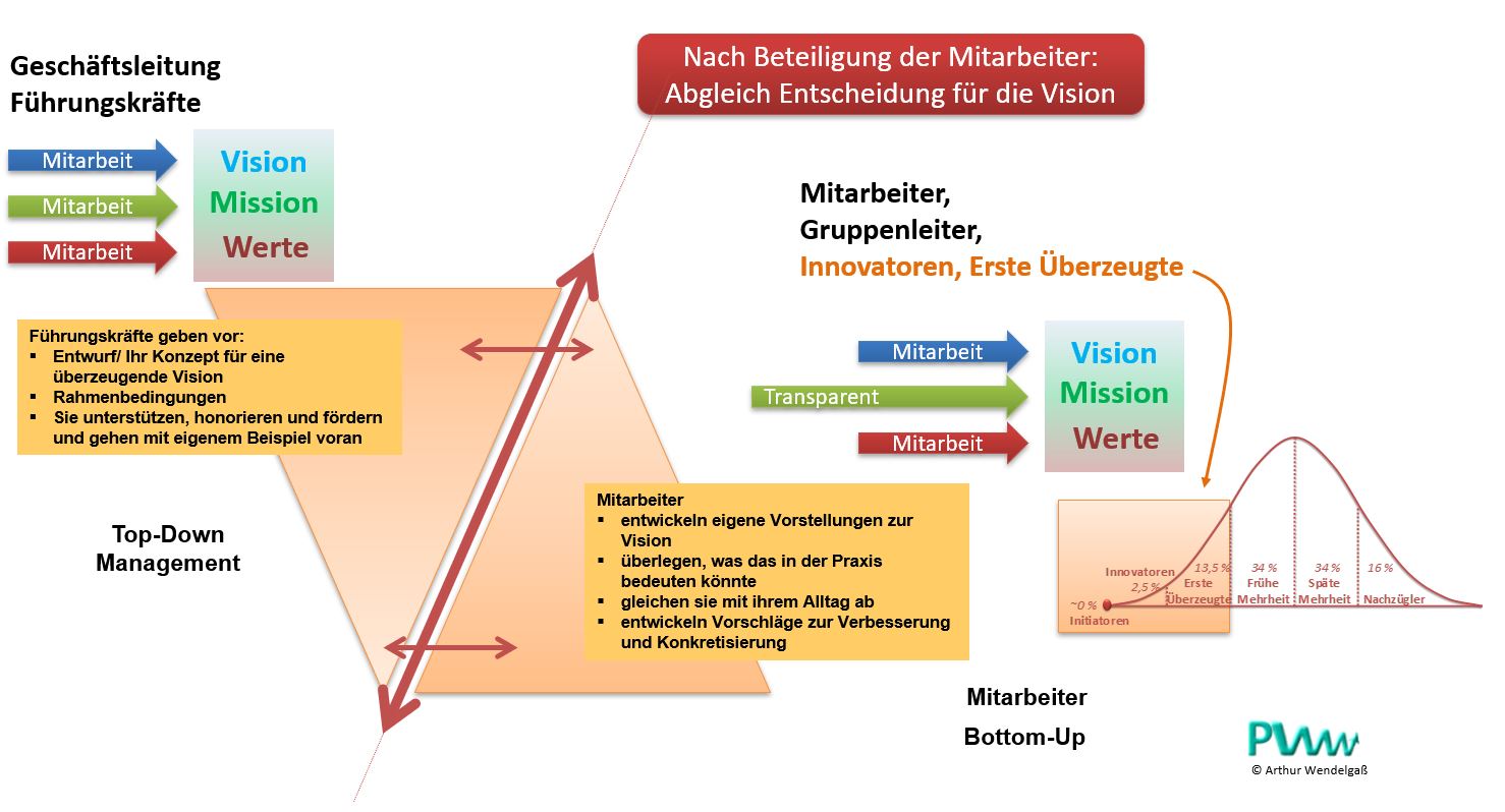 Es is daher sinnvoll, die Wertebasis gemeinsam über alle Organisationsebenen zu entwickeln und zu kommunizieren. Dabei ist es von Vorteil, wenn dies im kleineren Rahmen initiiert wird und über das ganze Unternehmen ausgerollt wird. Hierbei gibt die Unternehmensführung lediglich die Rahmenbedingungen vor.